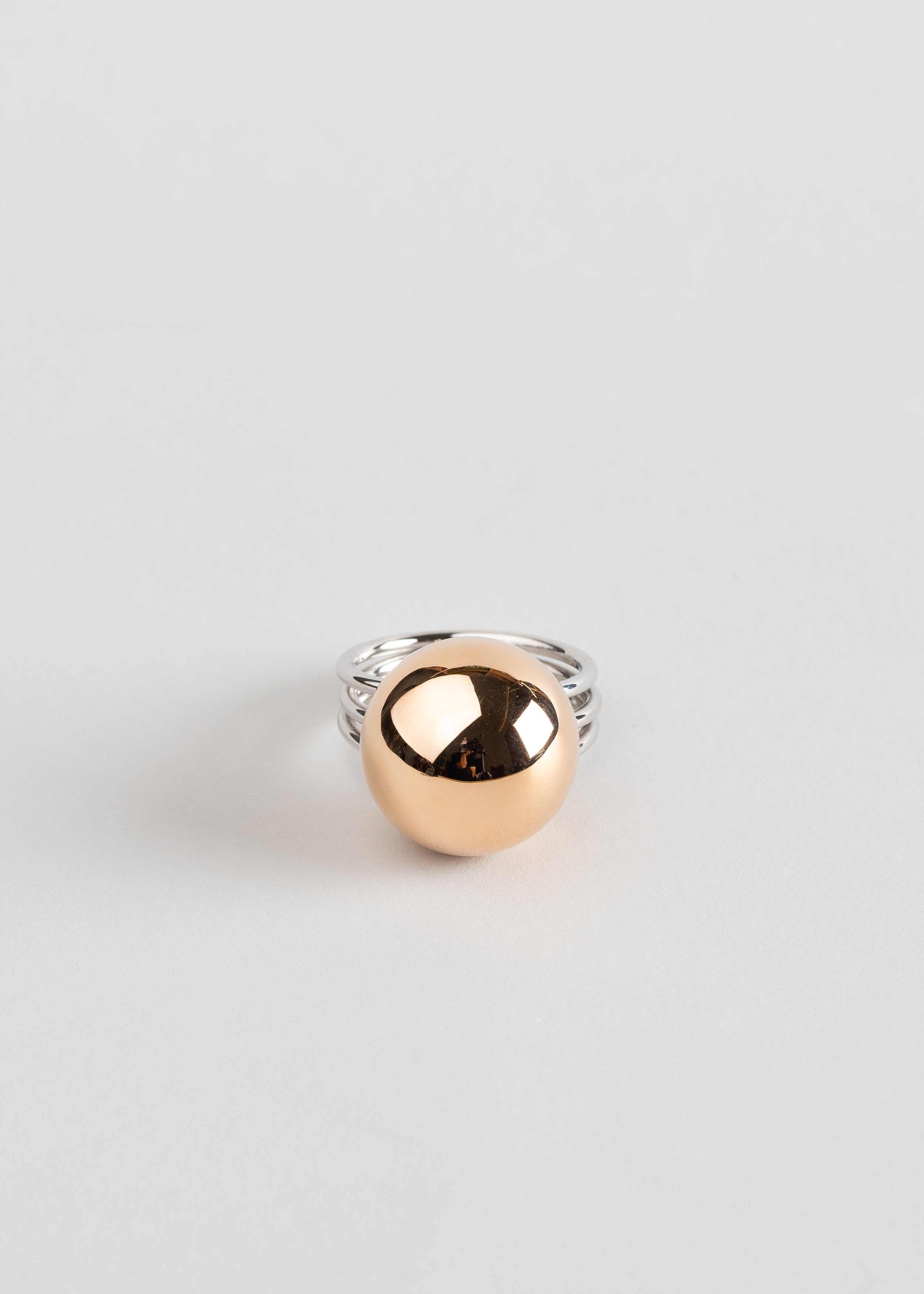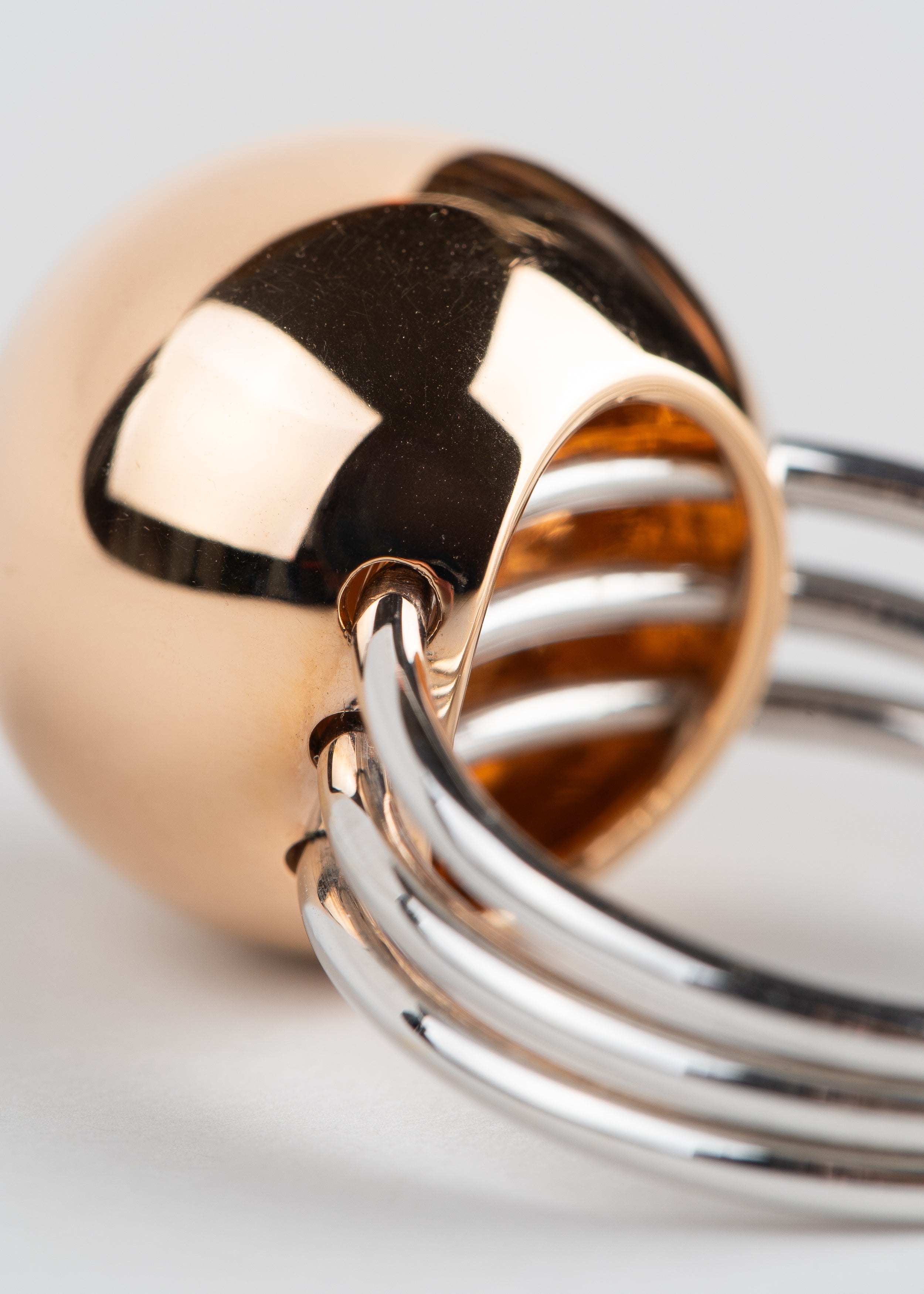 Movable Sphere on a 3-wheel ring with contrasting rose gold and white gold color.