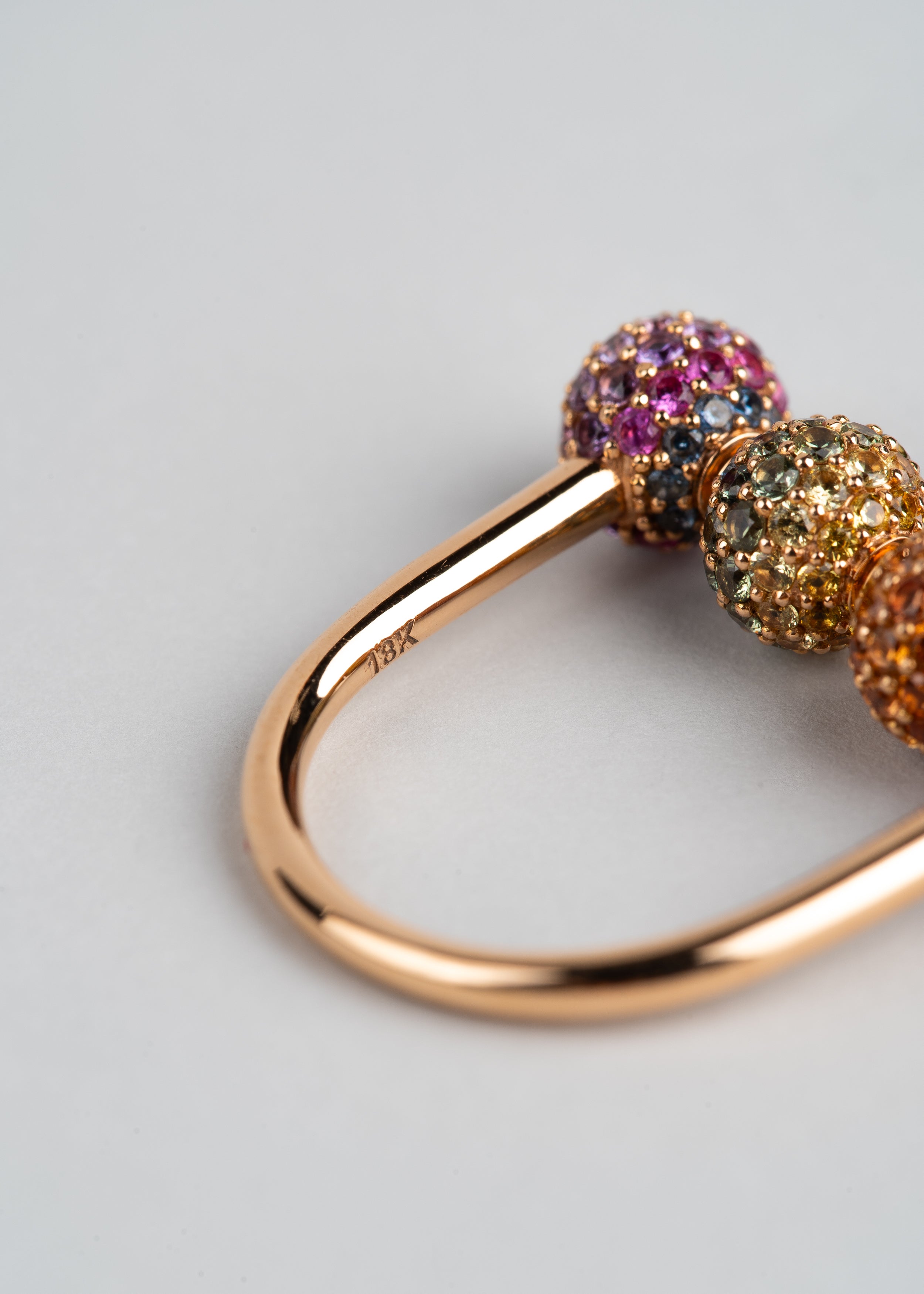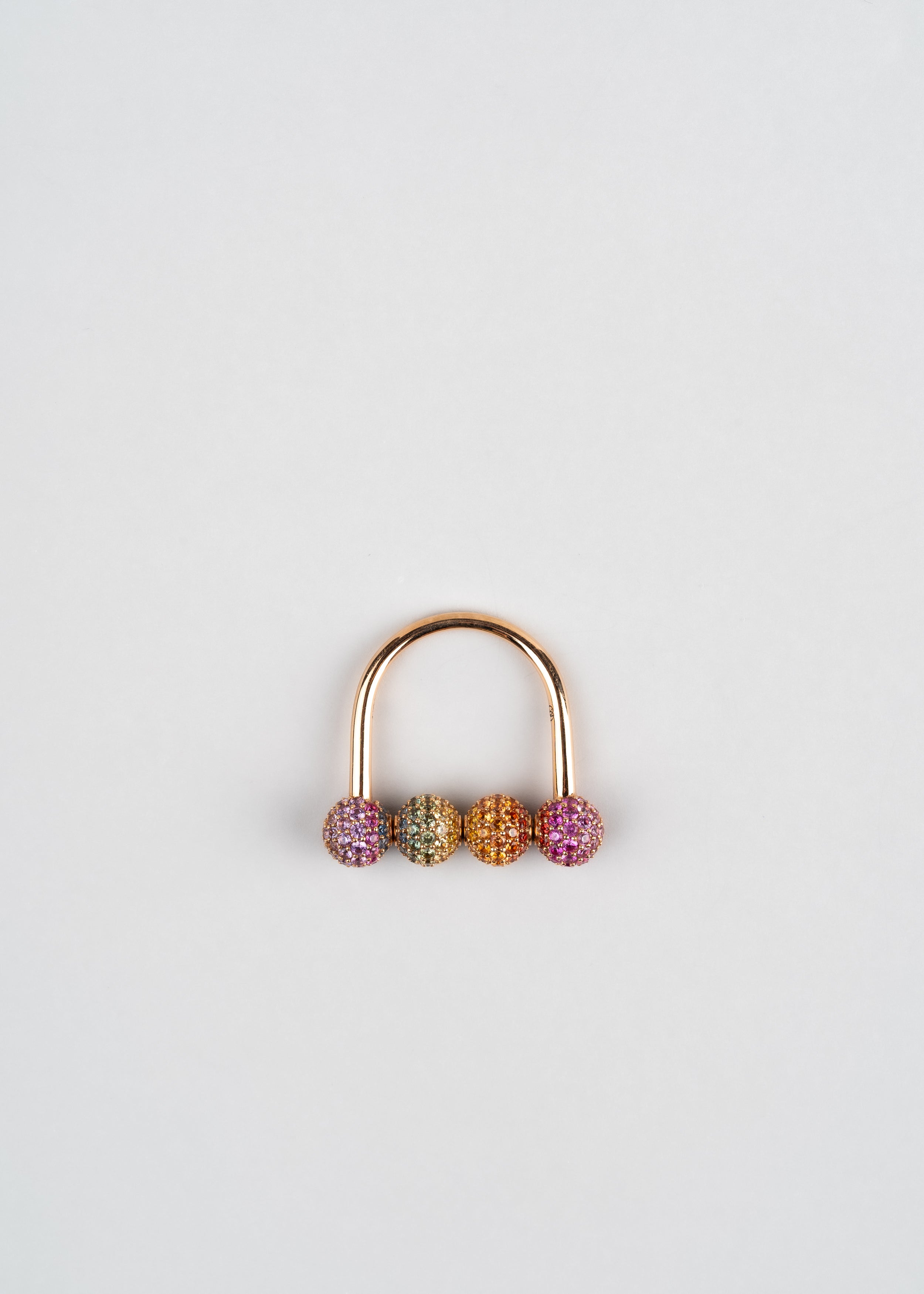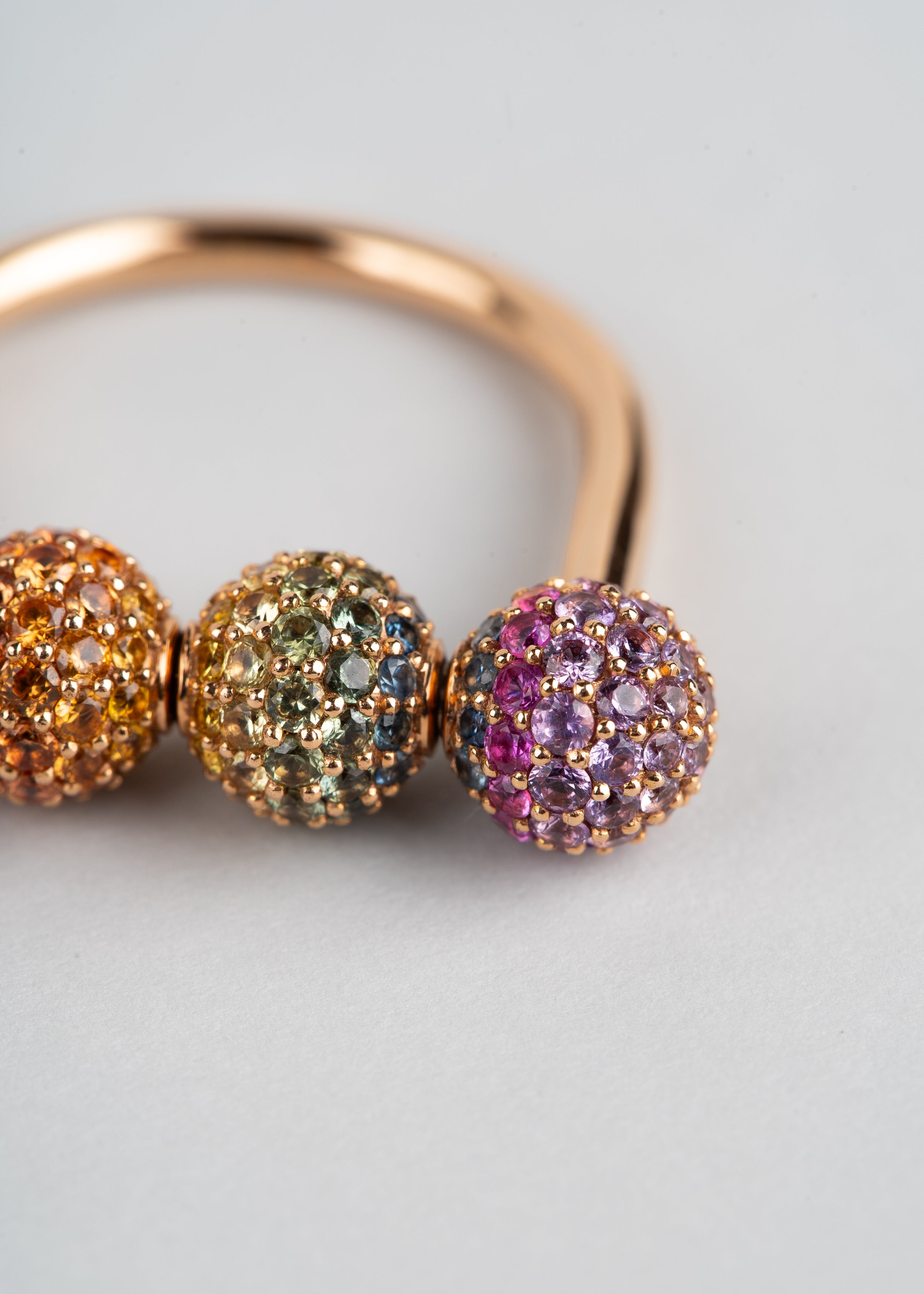 The same roller mechanism like the other Roller Rings in the Fidget Collection, encrusted with rainbow ombré multi-color natural sapphires.